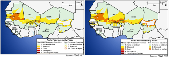 지도/ 서아프리카 지역의 식량위기를 예측한 지도로 각각 왼쪽은 2012년 4월~ 6월까지, 오른쪽은 7월에서 9월까지 위험도를 색상으로 표시했다. 초록 – 피해 없거나 경미한 단계, 노랑 – 피해가 심각한 단계, 주황 – 식량위기 단계, 빨강 – 긴급구호 단계, 자주 – 재앙적인 기근 상황. 자료 출처: 기근조기경보네트워크(FEWNSET)