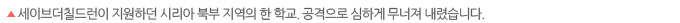 Q. 마지막 질문입니다. 위기 상황에서 교육이 보장받을 수 있도록 국제사회가 앞으로 해야 할 일은 무엇일까요? 기금 마련과 전문가 육성이 필요해요. 무엇보다 이번 세계교육포럼을 이끈 한국정부를 포함해 전 세계가 ‘어떤 상황에서도 교육을 지속하도록 하겠다’는 약속을 이행하기 위해 노력해야 하고요. 세이브더칠드런 코리아에서 분쟁과 빈곤, 사회적 악습으로 소외된 아프리카 여자 아이들의 교육을 지원하는 ‘스쿨미캠페인’을 벌이고 있는 것을 비롯해 전 세계 세이브더칠드런은 분쟁, 재난 상황에서도 모든 아이들이 제대로 된 교육을 받도록 노력하고 있어요. 여러분께서도 관심과 동참을 통해 아이들의 교육을 함께 지지해 주세요. 글 박영의(커뮤니케이션부) 분쟁과 재난으로 학교에 다닐 수 없는 아이들이 |