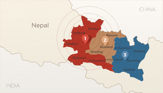 지진 피해 주민 800여 만 명, 피해 아동 320여 만 명 ▶뭉링(Mungling) 지역: 고르카, 람중, 타나훈, 치트완, 마콴푸르 • 담요, 방수포, 주방용품, 식량, 위생키트 등 구호물품 담은 키트 7000여 가구에 전달 ▶카트만두(Kathmandu) 지역: 라수와, 다딩, 누와콧, 둘리켈, 라릿푸르, 카트만두, 박타푸르 • 방수포 1만 장, 주방용품 키트 3109개, 임시거주지 키트 766개 지원 ▶둘리켈(Dhulikhel)지역: 신두팔초크, 돌라카, 카프레팔란초크, 신둘리, 라메찹 • 방수포 2만 6000여 장, 임시거주지 키트, 주방용품, 위생키트, 담요, 태양광 전등 지원