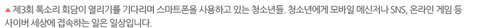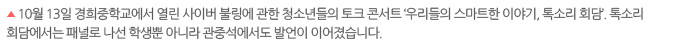 이 이야기는 세이브더칠드런이 중학교 학생들과 나누었던 사연으로, 실제 청소년들이 들려준 이야기를 각색해 만들었습니다. 청소년 시기에는 친구가 가족만큼 소중해지고, 아이돌 가수가 우상처럼 다가옵니다. 풍성해지는 감정만큼 청소년들은 친구와 나눌 이야기가 많아지게 마련인데요. 그래서 우리나라 청소년들은 모바일 메신저나 SNS를 적극적으로 이용하는 사용자이기도 합니다. 그런데 소통과 공감을 위해 시작했던 이런 서비스가 오히려 청소년의 마음을 아프게 할 때도 있습니다. 디지털 기기를 이용한 또래간 위협이나 괴롭힘을 뜻하는 사이버 불링이 대표적인 예입니다. 일상을 해칠 만큼 과도하게 스마트폰이나 게임에 몰입하는 경우도 발생합니다. 여기에 대해 우리 청소년들은 어떻게 생각할까요? 세이브더칠드런은 10월 13일과 21일, 31일 서울 경희중학교와 보성여자중학교, 마이크임팩트 엠스퀘어에서 토크 콘서트 ‘우리들의 스마트한 이야기, 톡소리 회담(이하 톡소리 회담)’을 열고 청소년들과 함께 이야기를 나누어 보았습니다. 우리들의 스마트한 이야기, 톡소리 회담