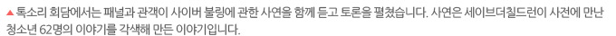 톡소리 회담에서 만난 청소년들이 입을 모아 한 이야기는 ‘내 이야기 같아요’인데요. 그 비결은 무엇이었을까요? 청소년의 마음은 청소년 스스로가 가장 잘 아는 법입니다. 톡소리 회담에 앞서 세이브더칠드런은 중·고등학교에 다니는 남녀 청소년 62명을 만나 디지털 미디어를 사용하는 환경과 경험에 대해 이야기를 들었습니다. “친구들이 종종 저격글(상대의 이름은 밝히지 않지만 다른 사람도 짐작할 수 있게끔 누군가를 비방하는 글)을 SNS에 올리는데, 그런 이유를 알고 보면 지나가다 부딪혔는데 사과를 하지 않은 것처럼 사소한 경우가 많아요.” “나를 싫어하는 친구들이 단체 채팅방에서 나에 대해 험담한다는 얘기를 들은 적이 있어요.” 비단 세이브더칠드런이 만난 청소년뿐 아니라 이 시대를 사는 청소년이라면 낯설지 않은 이야기일 것입니다. 하지만 이러한 경우에 ‘사이버 불링’이나 ‘사이버 폭력’을 떠올리는 경우는 많지 않습니다. 사이버 불링의 의미를 알면서도 자신에게 혹은 친구에게 일어나고 있는 일이 사이버 불링임을 알아채지 못한다는 것인데요. 그래서 세이브더칠드런은 우리 주변에서 일어날 법한 이야기로 함께 사이버 불링에 대해 이야기해볼 수 있는 자리로 톡소리 회담을 준비했습니다. 청소년 62명의 이야기는 각색을 통해 ‘내 이야기’ 같은 사연으로 재탄생했습니다. 따뜻한 엄지와 똑똑한 검지를 가진 청소년 세대를 꿈꾸며