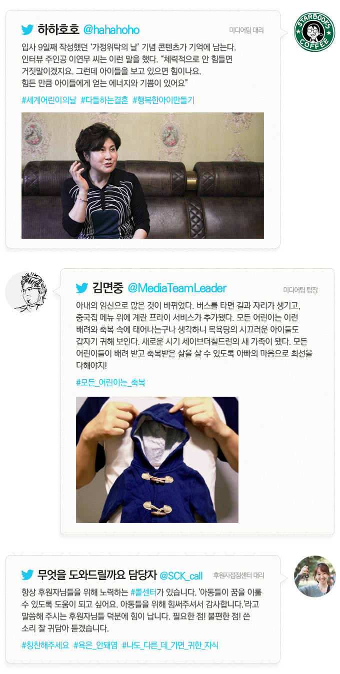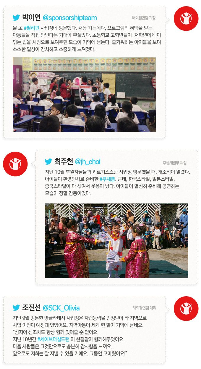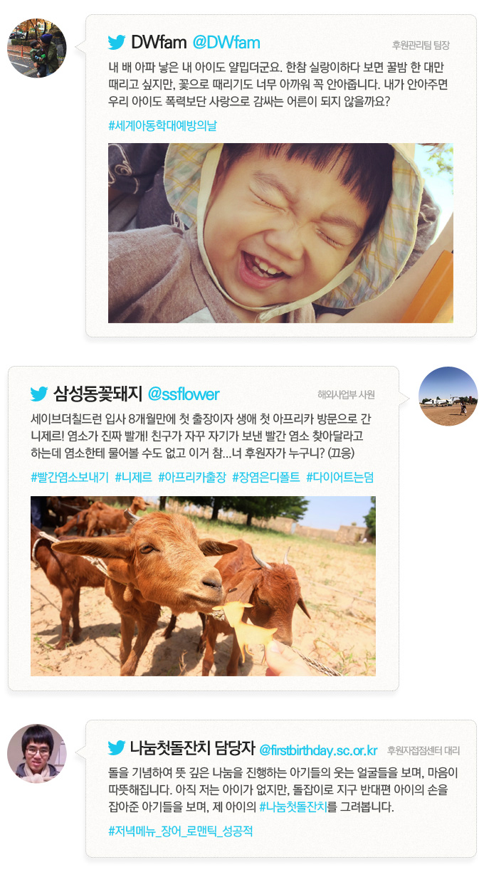 세이브더칠드런 직원들이 말하는 올 한 해, 가장 감동적이었던 순간 어느덧 2015년 한 해가 저물고 있습니다. 여러분은 한 해를 잘 마무리하고 계신가요? 세이브더칠드런 직원들이 지난 한 해를 돌아보며 감동적인 순간들을 적었습니다. 아동을 위해 일해온 이들의 2015년은 어떤 이야기들로 채워졌을까요? 각자의 자리에서 업무를 하면서 혹은 일상 속에서 경험하고 느낀 것들을 가상 트위터 계정에 담아봤습니다.