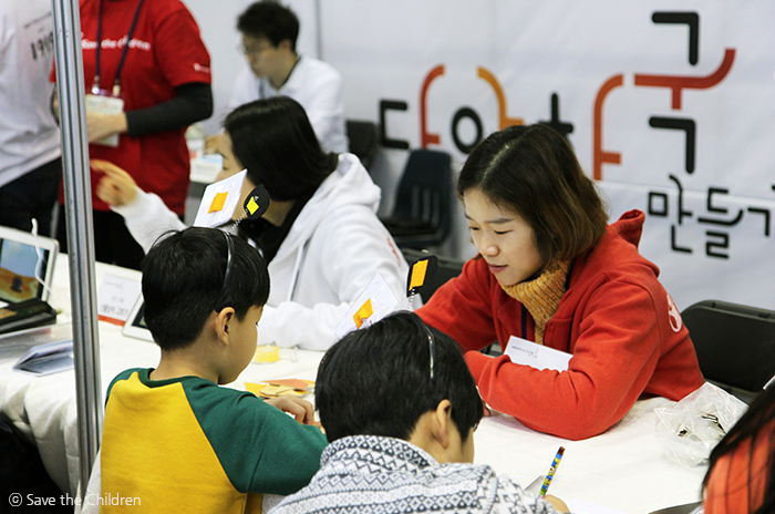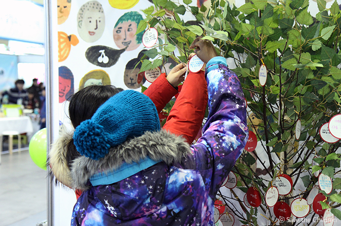 ‘실천의지 다짐퍼즐’을 맞추며 다름을 인정하고 존중하는 문구를 마음속에 새긴 아이. ‘선물상자 고르기’ 영상을 보며 겉모습만 보고 판단하는 편견을 극복한 아이. ‘다양한국 뱃지만들기’ 코너에서 직접 다양한 피부색, 머리색의 아이들이 그려진 뱃지를 만든 아이까지. 저마다 코너에서 체험한 뒤, 아이들은 느낀 점을 종이에 적어 ‘생각나무’에 걸었고 그것으로 세이브더칠드런 부스 방문이 끝났습니다.