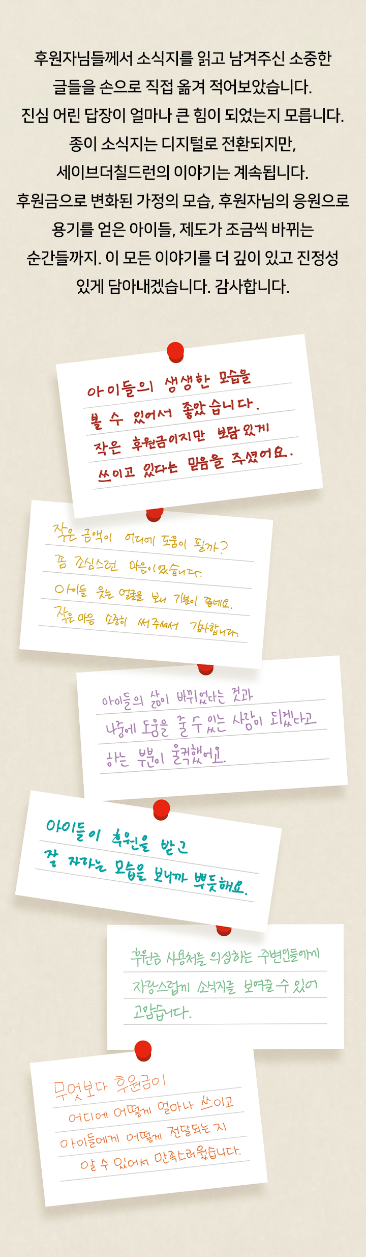 아동학대는 아이의 죽음으로 이어지기도 합니다. 누군가에게는 한 번의 비극으로 끝나는 사건일지 모르지만, 세이브더칠드런은 그 안에서 아이들이 어떤 권리를 빼앗겼는지, 우리 사회가 무엇을 놓쳤는지를 이야기해왔습니다. 그리고 반복되는 비극 앞에 다시는 같은 일이 일어나지 않도록 정책을 제안하고, 사회에 경고하고, 변화를 촉구하고 있습니다.