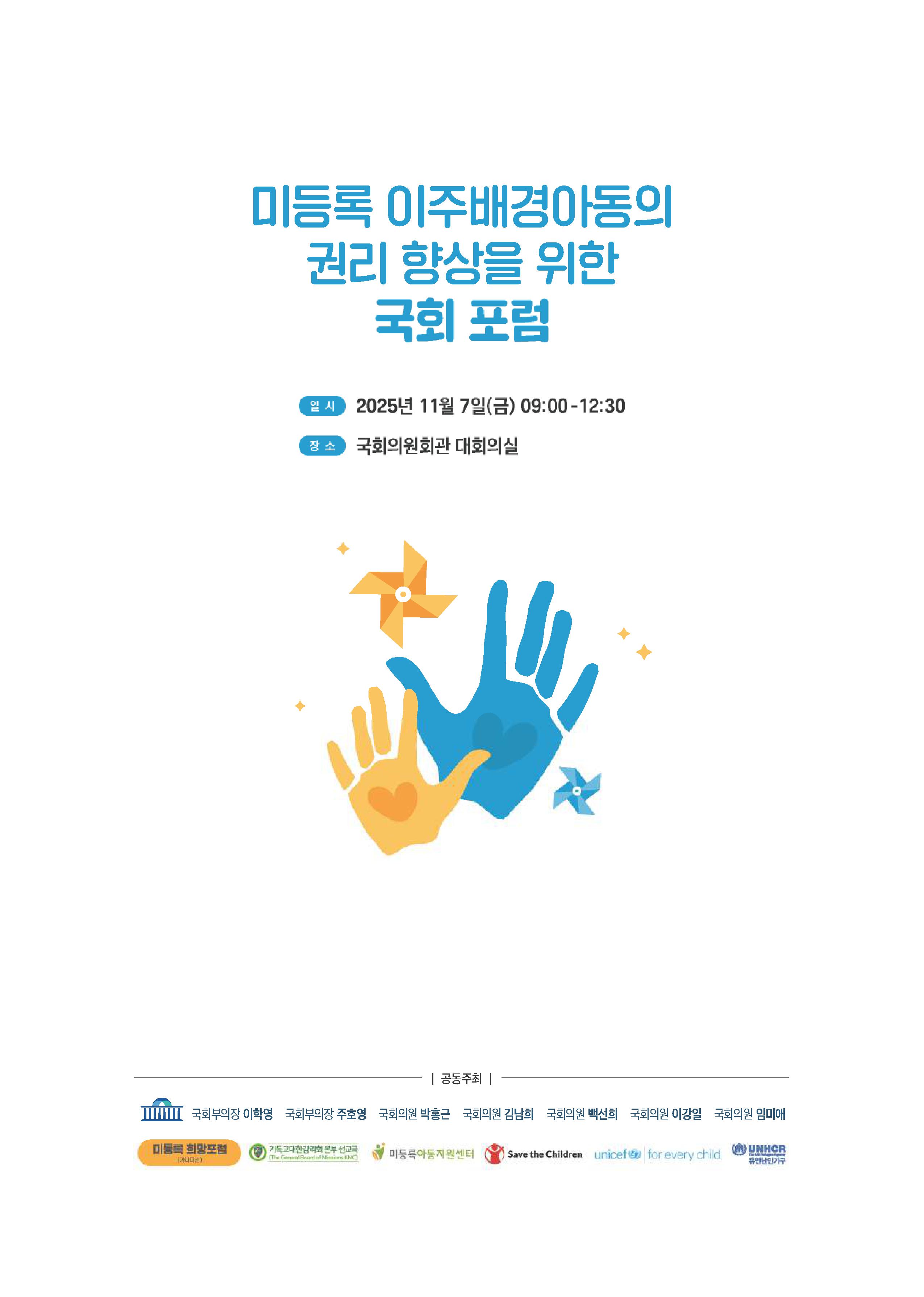 세이브더칠드런은 오는 11월 7일(금), 「미등록 이주배경아동의 권리 향상을 위한 국회 포럼」을 개최합니다.
