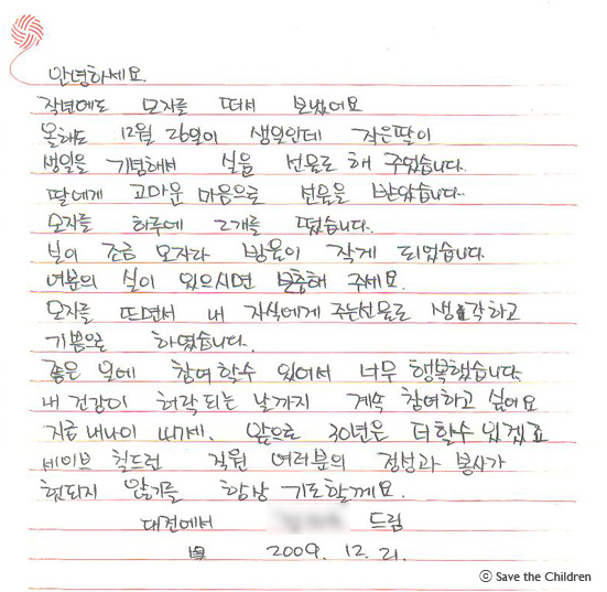 시즌 4가 끝나는 2011년 3월 15일까지 주중 매일 오후 2시 <신생아 살리기 모자뜨기 캠페인> 시즌2와 시즌3에 참여해주신 모자 후원자님의 사연을 소개합니다.