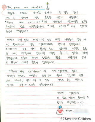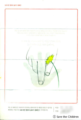 사진/ 더 많은 사람들이 캠페인에 참여했으면 좋겠다는 모자 후원자님의 사연과 5세 미만 영유아 살리기 캠페인을 지지하는 손을 그려주신 손그림.