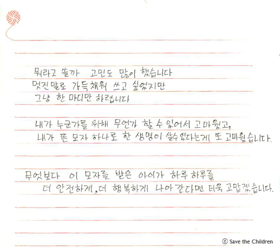 사진/ 모자를 받은 아이가 더 안전하게 살 수 있어 고맙다는 모자 후원자님의 사연