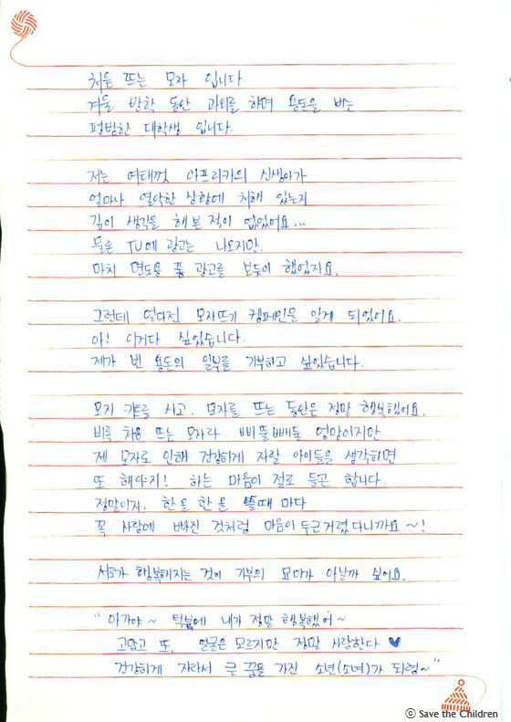 사진/ 과외로 번 용돈으로 모자를 뜨셨다는 모자 후원자님께서 보내주신 소중한 사연