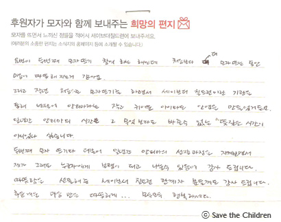 오늘은 시즌 4에 참여하신 모자 후원자님께서 보내 주신 따뜻한 사연입니다.