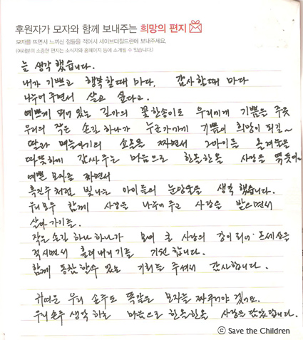 오늘은 시즌 4에 참여하신 모자 후원자님께서 보내 주신 따뜻한 사연입니다.