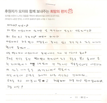 오늘은 시즌 4 참여하신 모자 후원자님께서 보내 주신 따뜻한 사연입니다.