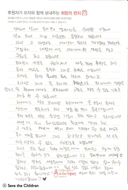 오늘은 시즌 4 참여하신 모자 후원자님께서 보내 주신 따뜻한 사연입니다.