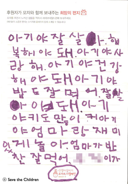 사진/ 모자를 받을 아기가 건강하게 잘 자라서 행복하기를 바란다는 어린 모자 후원자님의 사연