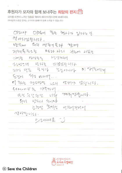 오늘은 시즌 4 참여하신 모자 후원자님께서 보내 주신 따뜻한 사연입니다.