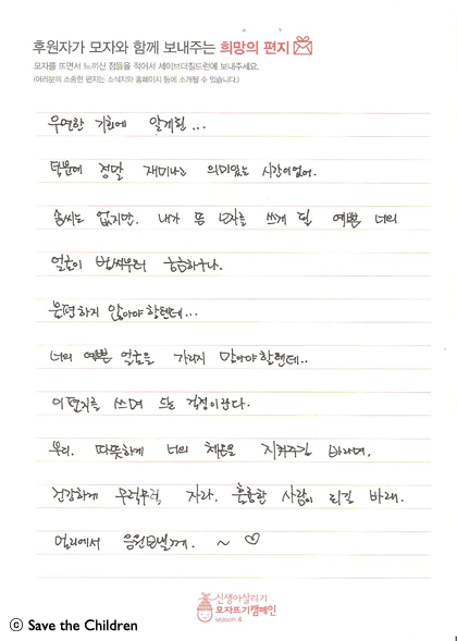 오늘은 시즌 4 참여하신 모자 후원자님께서 보내 주신 따뜻한 사연입니다.