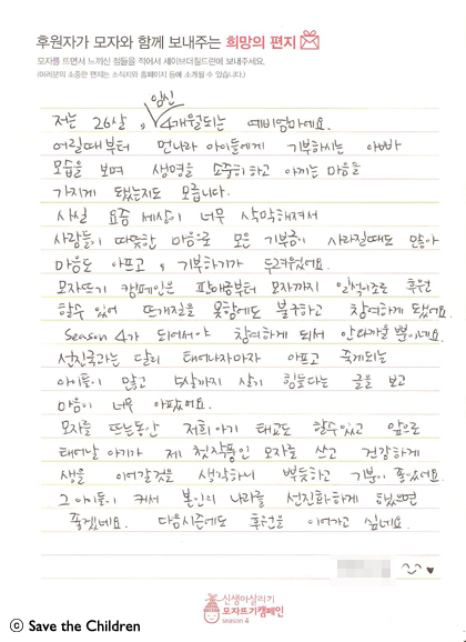 오늘은 시즌 4 참여하신 모자 후원자님께서 보내 주신 따뜻한 사연입니다.