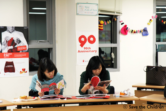 사진/ 먼저 온 참가자들이 기빙클럽 기금모금 안내서와 세이브더칠드런 리플릿 등을 살펴보고 있다.