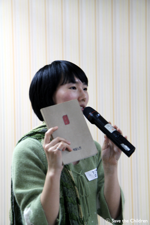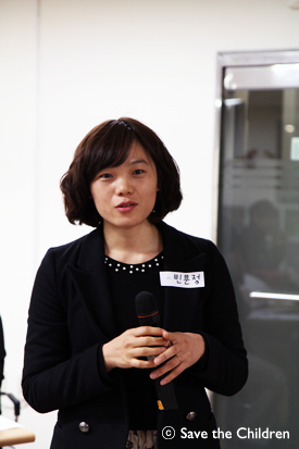최혜정 마케팅커뮤니케이션부장의 세이브더칠드런 소개로 첫모임이 시작되었습니다. 최혜정 부장이 분쟁영향지역 아동 교육지원사업인 'Rewrite the Future' 캠페인과 그 일환으로 코트디부아르에 학교를 지은 경험을 이야기하자 참가자들은 메모를 해 가며 귀 기울여 들었습니다. 최혜정 부장은 아동에게 동정하지 말 것을 당부하며 아동은 도움을 받을 권리가, 성인은 아동에게 도움을 줄 의무가 있음을 강조했습니다.