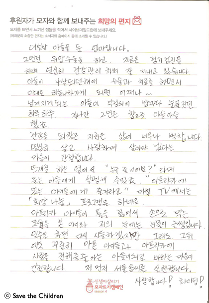 아픈 아이들과 아프리카에 사랑을 전해줄 줄 아는 아들이 되길 바라는 마음이 간절합니다.