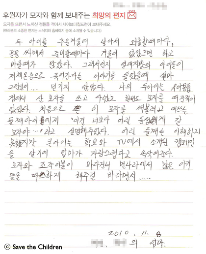 오늘은 시즌 4 참여하신 모자 후원자님께서 보내 주신 따뜻한 사연입니다.