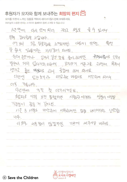 오늘은 시즌 4 참여하신 모자 후원자님께서 보내 주신 따뜻한 사연입니다.