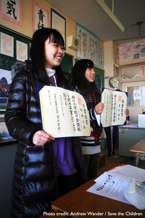 이번 졸업식과 아동친화공간(CFS)은 공통의 목적이 있습니다. 힘든 상황에 놓인 아동에게 일상감을 주어 아동이 자신에게 벌어진 일을 받아들일 수 있는 여유를 준다는 점입니다. 이미 생긴 일을 되돌이킬 수 있는 방법은 아무 것도 없습니다. 하지만 그 피해를 줄일 수는 있습니다. 지진과 해일을 겪은 이 아동들에게는 아직 미래가 있습니다.