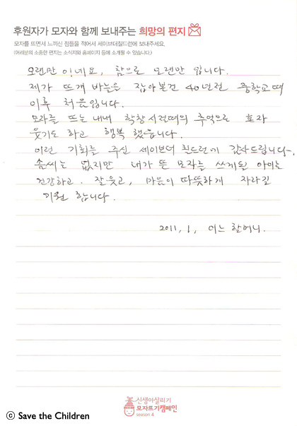 오늘은 시즌 4 참여하신 모자 후원자님께서 보내 주신 따뜻한 사연입니다.