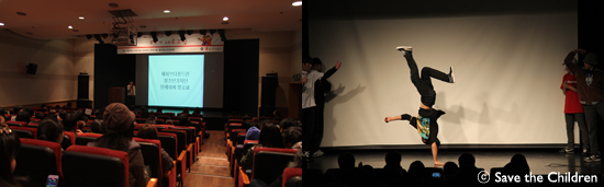 사진/ 발표회장 전경(좌), 발표회의 시작을 알리는 청소년 춤 동아리의 축하공연(우)