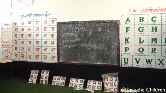 사진/ 아동친화적으로 꾸민 교실 내부 모습. 네팔어의 기본 글자(왼쪽)와 알파벳이 적혀있다