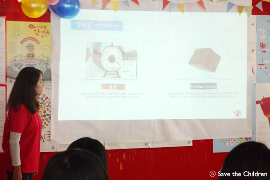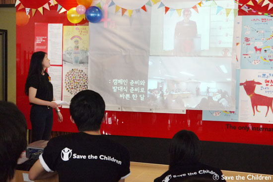 뒤이은 ‘국제개발팀’의 발표에는 세이브더칠드런이 진행 중인 글로벌 캠페인에 대한 아이디어들이 가득했습니다. 전 세계 영양실조로 고통 받는 아이들의 현실을 알리기 위한 ‘살붙이기’, ‘행복한 다이어트’, ‘캠페인용 게임 제작’ 등 1년 간 10여 차례의 캠페인을 통해 1만 명의 서명을 받는 것을 목표로 하고 있습니다. 현장에서 하는 캠페인 이외에도 아동을 위한 정책 개선을 위해 공부도 게을리하지 않겠다는 각오도 다졌습니다. 캠페인을 통한 현장 경험과 리서치를 바탕으로 한 이론으로 무장하여 아동권리에 대한 사람들의 생각의 변화를 유도하겠다는 것입니다.