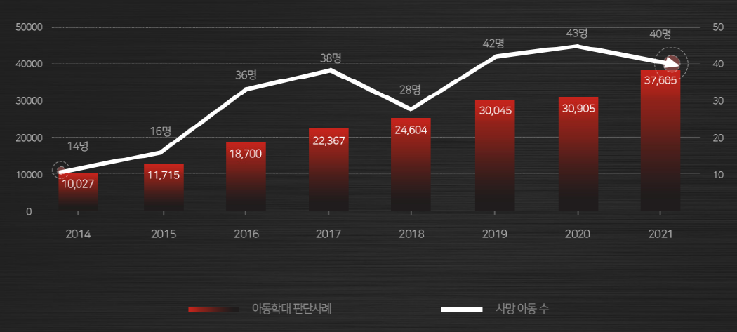 대한민국에 여전히 아동학대로 고통받는 아이들이 많다는 사실 알고 계셨나요? 2021년 보건복지부 아동학대 주요통계에 따르면, 2021년 기준 아동학대 신고 건수는 53,932건, 아동학대 판단 사례는 37,605건, 아동학대로 사망한 아동은 40명에 이른다고 합니다.