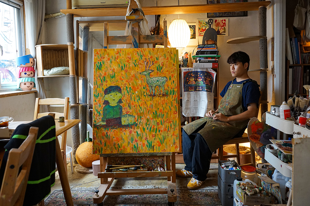 코로나로 힘들었던 시기, 작업실에서 멍하니 시간을 보내는 일이 많았어요. 평소에도 외출을 많이 하는 편은 아니라 작업실에서 시간을 보내는 것 자체가 제게 어려운 일은 아니었는데, 심적으로는 꽤 힘들었던 것 같아요. 그러면서 나의 좋았던 시절, 나의 기원에 대해 되짚어보게 되었는데, 자연스레 저의 어린 시절이 떠올랐습니다. 그래서 비교적 어린 인물들을 작업에 표현하게 되었던 것 같아요.