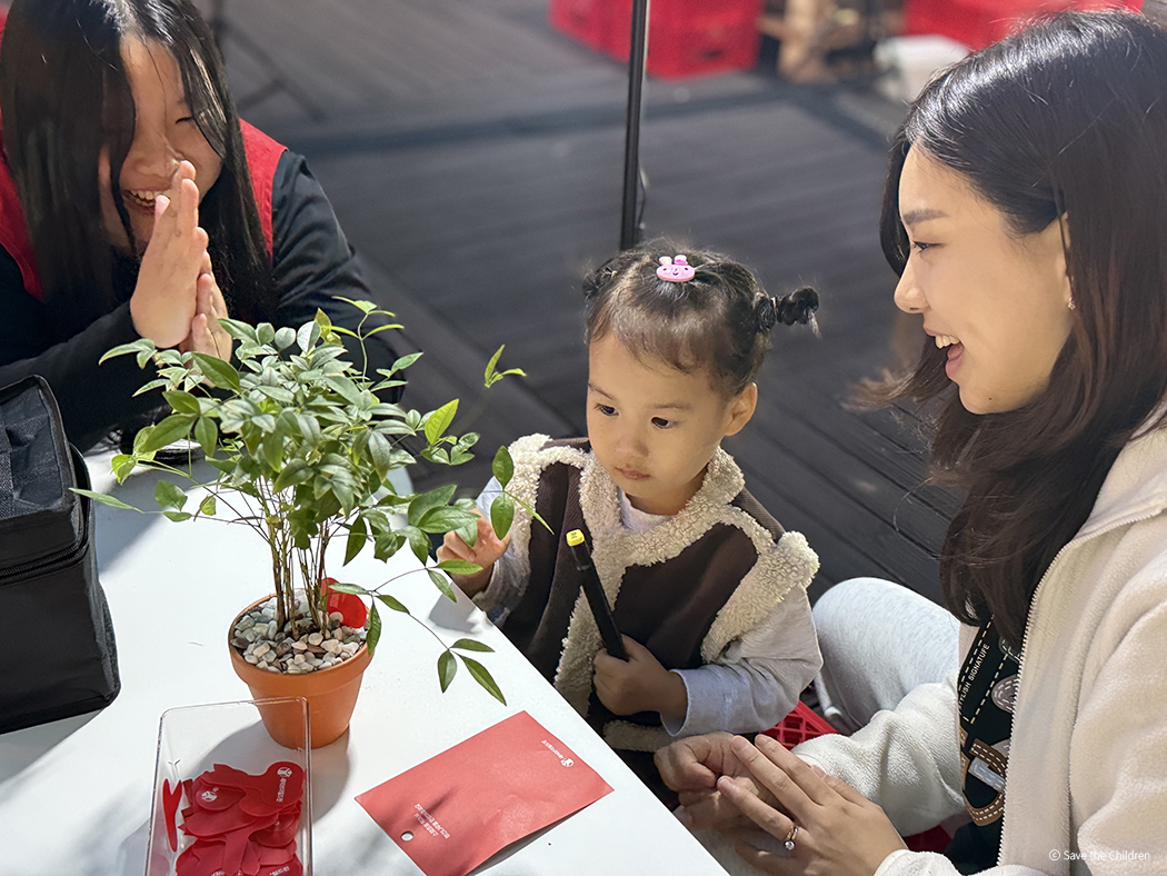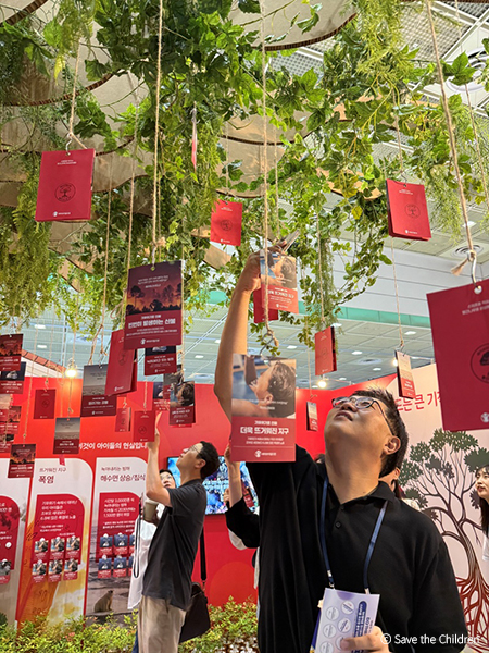 빨간나무가 자리한 부스에 방문한 참여자들은 가뭄, 폭염, 산불 등의 기후재난을 알리는 카드를 통해 기후위기 속 아이들의 현실을 이해하고, 응원 메시지를 빨간나무에 매달며 희망을 전했습니다. 그리고 천여 명의 참여자들의 마음이 순간의 결심에 그치지 않고, 오래 기억될 수 있도록 세이브더칠드런은 집에서 키울 수 있는 빨간나무(남천)를 선물했죠.