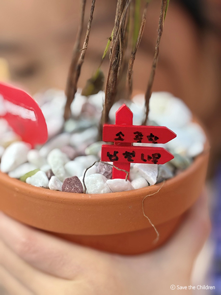 ▲ 아동이 남긴 응원 메시지와 예쁘게 꾸며진 남천나무 화분
