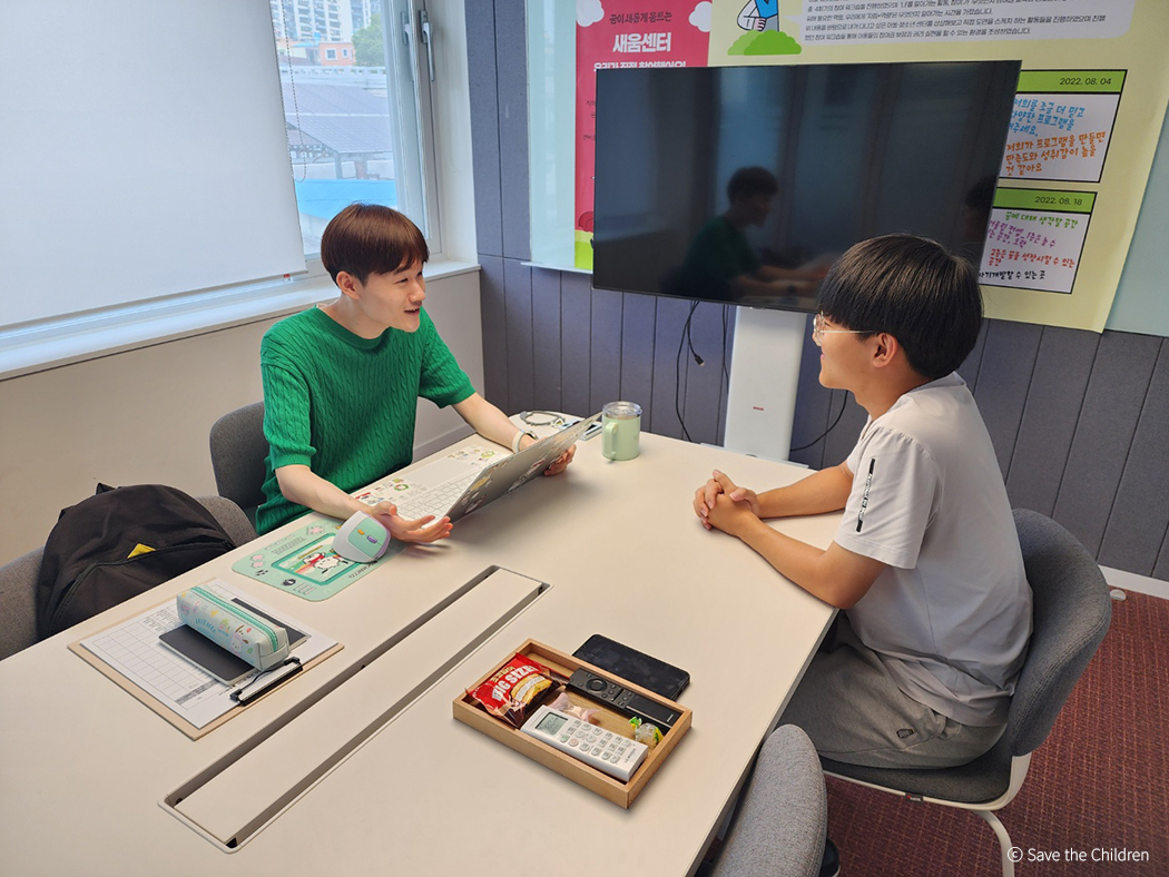 ▲ 드림세이버 선생님과 이야기를 나누고 있는 준이