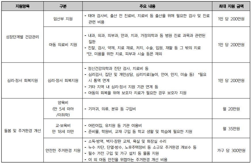 - 국내 체류 외국인으로서 합법적 체류자격이 없는 0~18세 아동 및 임산부