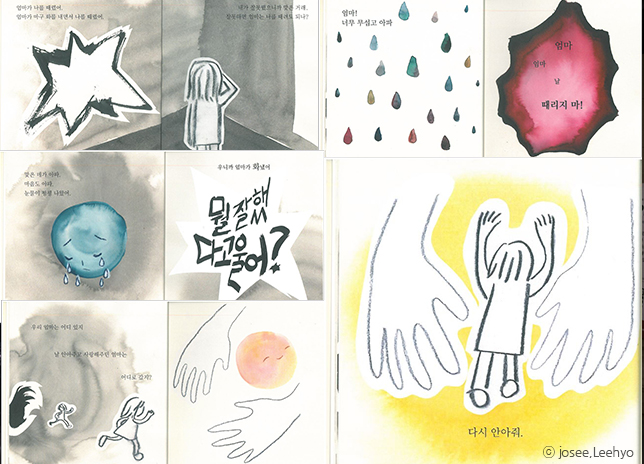 이효 아이가 상처받은 모습, 상처주는 사람의 모습을 콩테, 잉크 같은 재료를 써서 흑백 위주로 거친 질감으로 나타냈어요. 아이의 감정 표현은 밝은 색채를 많이 쓰고 수채화로 번지는 느낌을 사용해서 대조되게 표현했어요. 직접적인 표현은 피하고 추상적이고 직관적으로 감정을 담아내고자 했죠. 아이가 맞았을 때 자기 잘못을 깨닫는 게 아니라 공포심에 사로잡힌다는 걸 드러내고 싶었어요.