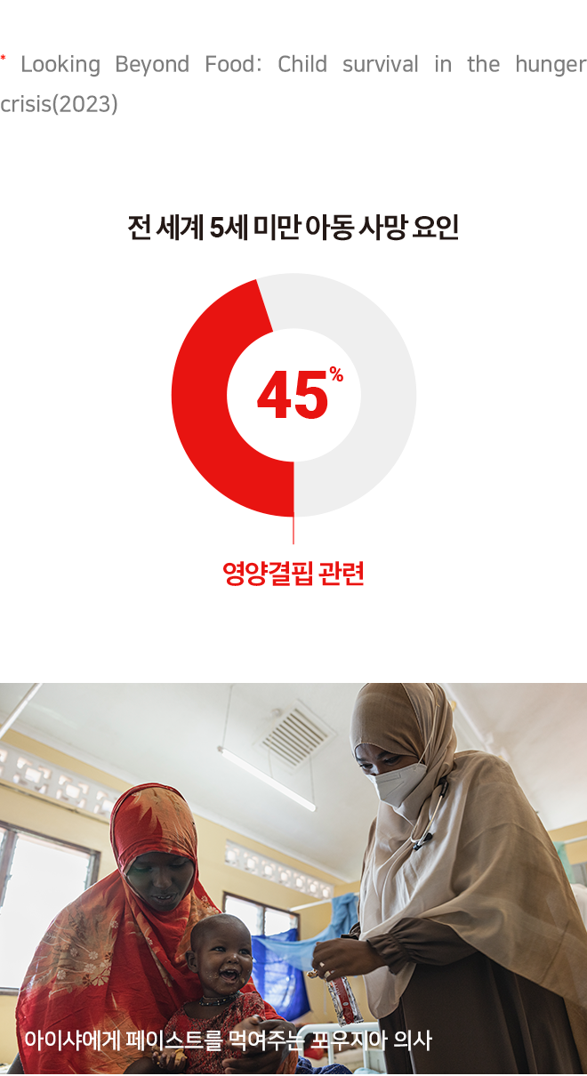 세이브더칠드런의 *<음식 그 너머를 바라보다:기아위기 속의 아동 생존> 보고서에 따르면 전 세계 5세 미만 아동 사망 요인 중 45%가 영양결핍과 관련 있으며 영양실조에 걸리지 않은 아동에 비해 질병으로 사망할 확률이 11배 더 높게 나타났습니다. 하루라도 더 빨리 영양 상태를 확인하고 치료하는 일은 더 많은 아동을 살리는 일입니다.