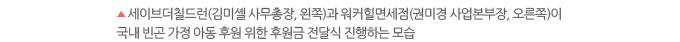 지난 2월 16일 워커힐면세점과 기부금 전달식을 가졌습니다. 워커힐면세점은 지난해 12월 28일부터 올해 1월 29일까지 ‘착한 소비 착한 기부 캠페인’을 진행, 1,004개 상품을 선정하여 판매 수익금의 일부(3,000만원)을 후원하였습니다. 후원금은 국내 빈곤 가정 아동 후원하는데 사용될 예정입니다.