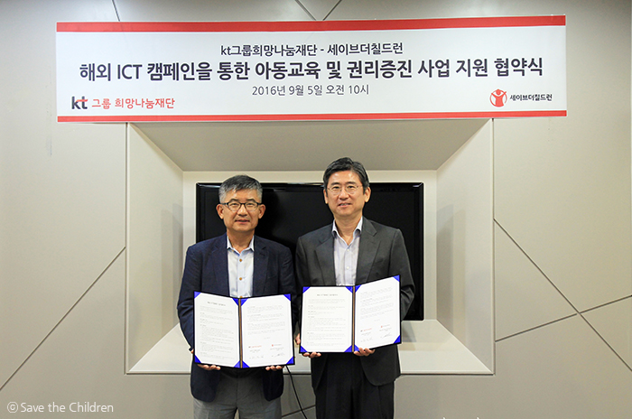 9월 5일, KT희망나눔재단은 KT그룹 임직원 자원봉사 플랫폼인 ‘기브스퀘어’를 통해 해외 ICT 사업 후원, 임직원 대상 아동권리교육 등을 진행하는 협약을 체결했습니다. 기브스퀘어를 통해 모금된 후원금은 우간다와 에티오피아의 보건인력 보건정보관리 교육 사업과 라이베이라 여아를 위한 IT교육 사업에 쓰일 예정입니다. 또한 세이브더칠드런은 KT그룹 임직원대상으로 아동권리 교육(반기 1회 이상)을 진행할 예정입니다.