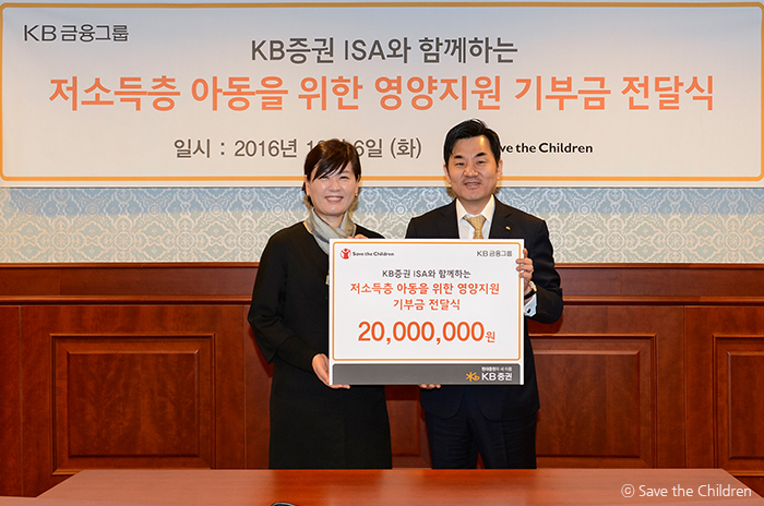 지난 12월 6일, KB증권(구 현대증권) 본사에서 ‘사랑을 담은 ISA’ 기부금 전달식을 진행했습니다. 이날 ‘사랑을 담은 ISA’ 가입자 3만명 돌파를 맞아 세이브더칠드런에 2,000만원을 국내 저소득층 아동을 위한 영양지원사업에 후원했습니다.