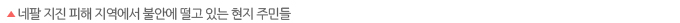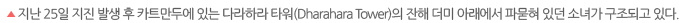 네팔에서 강도 7.9 의 지진이 발생해 2,000여 명의 사망자가 발생했습니다. 지진이 발생한 곳은 수도 카트만두와 포카라에서 80km 떨어진 지역입니다. 이번 지진은 지난 80년 만에 찾아온 최악의 참사로 지진 발생 위험 지역에 살아온 네팔 주민들에게조차 이번 지진은 그동안 경험한 것을 훨씬 뛰어넘는 규모였습니다. 수많은 빌딩이 붕괴된 상황에서 주민들은 남아있는 건물조차 강도 7.0에 달하는 추가 여진에 계속 견딜 수 있을지 확신하지 못하고 있습니다.