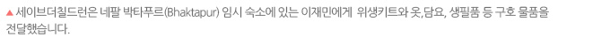 세이브더칠드런은 고르카(Gorkha)와 신두팔초크(Sindulpalchowk) 지역 외에도 다딩(Dhading)과 마콴푸르(Makwanpur), 치트완(Chitwan) 지역에도 구호팀을 파견했습니다. 임시 거주지 키트 568개를 비롯해 생필품 키트 636개, 신생아 키트 1000개 등의 구호품을 지역 곳곳에 전달했습니다. 신두팔초크 지역에는 추가로 방수포 150장과 임시 거주지 키트 198개를 지원했습니다.