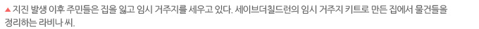 지진 발생 직후부터 현재까지 세이브더칠드런은 주민들에게 방수천, 담요 등을 신속히 공급하고 임시 거주지를 세웠으며 신생아 옷, 담요와 비누 등으로 구성된 신생아 키트를 제공해 추운 밤과 열악한 위생 상태에 노출되어 있는 영∙유아를 보호하는데 총력을 기울이고 있습니다. 또한, 현장에 도착하자마자 주민들을 지원할 수 있는 전문 장비를 갖춘 긴급 의료팀을 파견하고 있습니다.