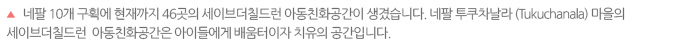 네팔 10개 구획 3817명의 아이들에게 46곳의 아동친화공간(Child Friendly Centre)이 생겼습니다.