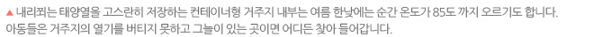 내리쬐는 태양열을 고스란히 저장하는 컨테이너형 거주지 내부는 여름 한낮에는 순간 온도가 85도 까지 오르기도 합니다. 아동들은 거주지의 열기를 버티지 못하고 그늘이 있는 곳이면 어디든 찾아 들어갑니다.