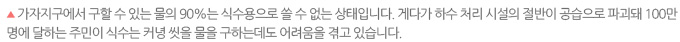 식수 문제도 심각합니다. 가자지구에서 구할 수 있는 물의 90%는 식수용으로 쓸 수 없는 상태입니다. 공습으로 수도시설이 파괴된데다 지하수가 과도하게 사용되다 보니 지하수층에 바닷물이 스며들고 있기 때문이기도 합니다. 가자지구 내 하수 처리 시설의 절반이 공습으로 파괴돼 100만 명에 달하는 주민이 식수는 커녕 씻을 물을 구하는데도 어려움을 겪고 있습니다.