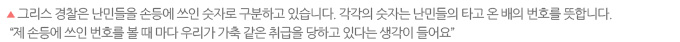 경제 위기로 사실상 국가 부도상태를 맞은 그리스 정부는 섬으로 밀려드는 난민들을 수용할 만한 장소도, 식량을 포함한 어떤 물품도 제공할 수 없다는 입장을 고수하고 있습니다. 또한 그리스 주민들이 중동 난민들을 지원하는 행위를 모두 불법으로 간주하고 있습니다.