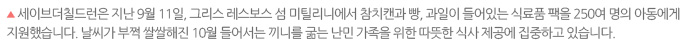 세이브더칠드런은 난민들이 하루 한 끼라도 따뜻하게 먹을 수 있도록 카라테페와 모리아 난민캠프 두 곳에 매일 각각 2500인 분의 따뜻한 식사(Hot Meal)를 제공하고 있습니다.